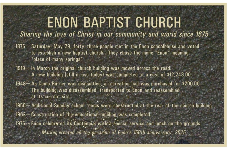 Enon has been sharing the love of Christ in our community and world since 1875. We hope you find the information you are looking for; but, if not, feel free to contact us. Better yet--come join us in fellowship and worship!